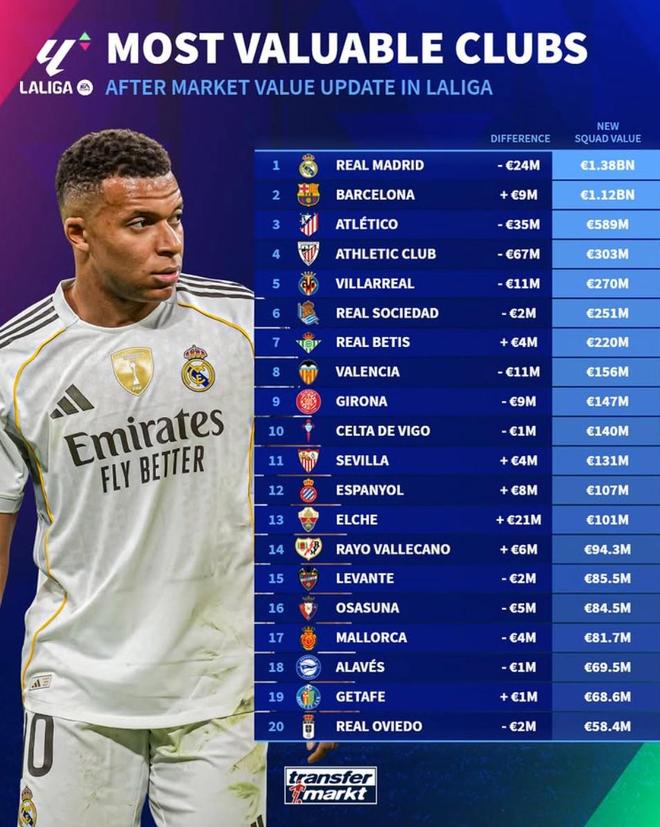 德转西甲俱乐部身价排名:皇马13.8亿第1,最低奥维耶多5840万